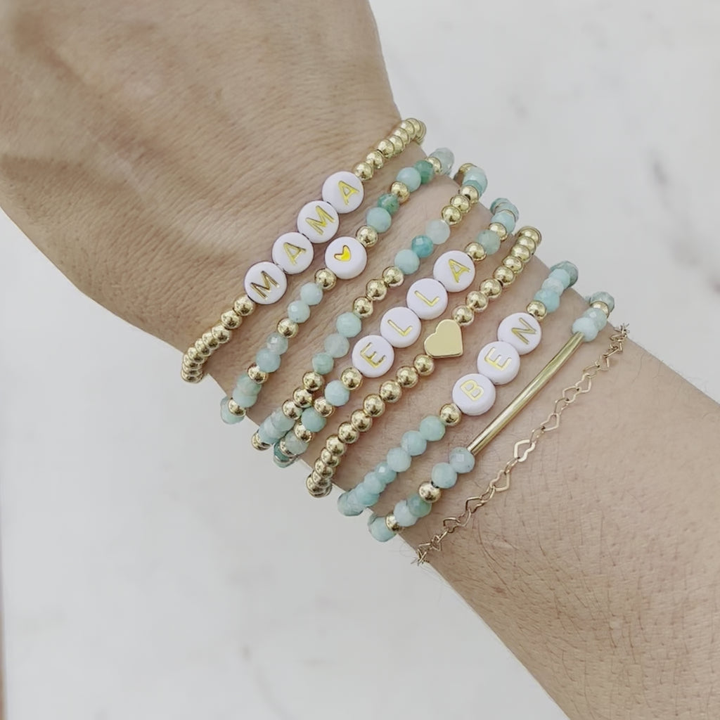 Create a bracelet stack that’s as unique as she is! Mix soft golds with pastels, add meaningful charms, or personalize with her name, initials, or a word that says it all.